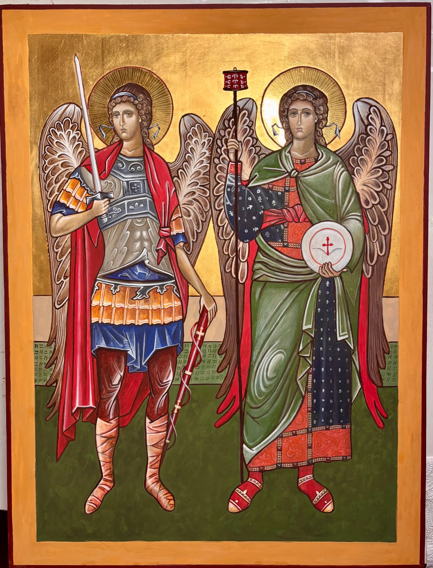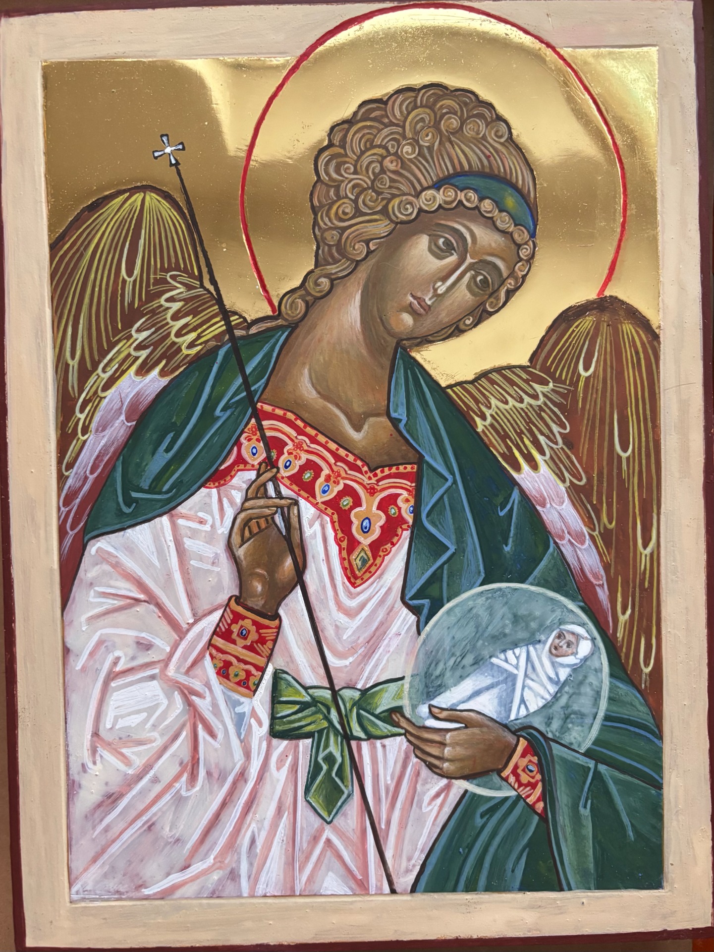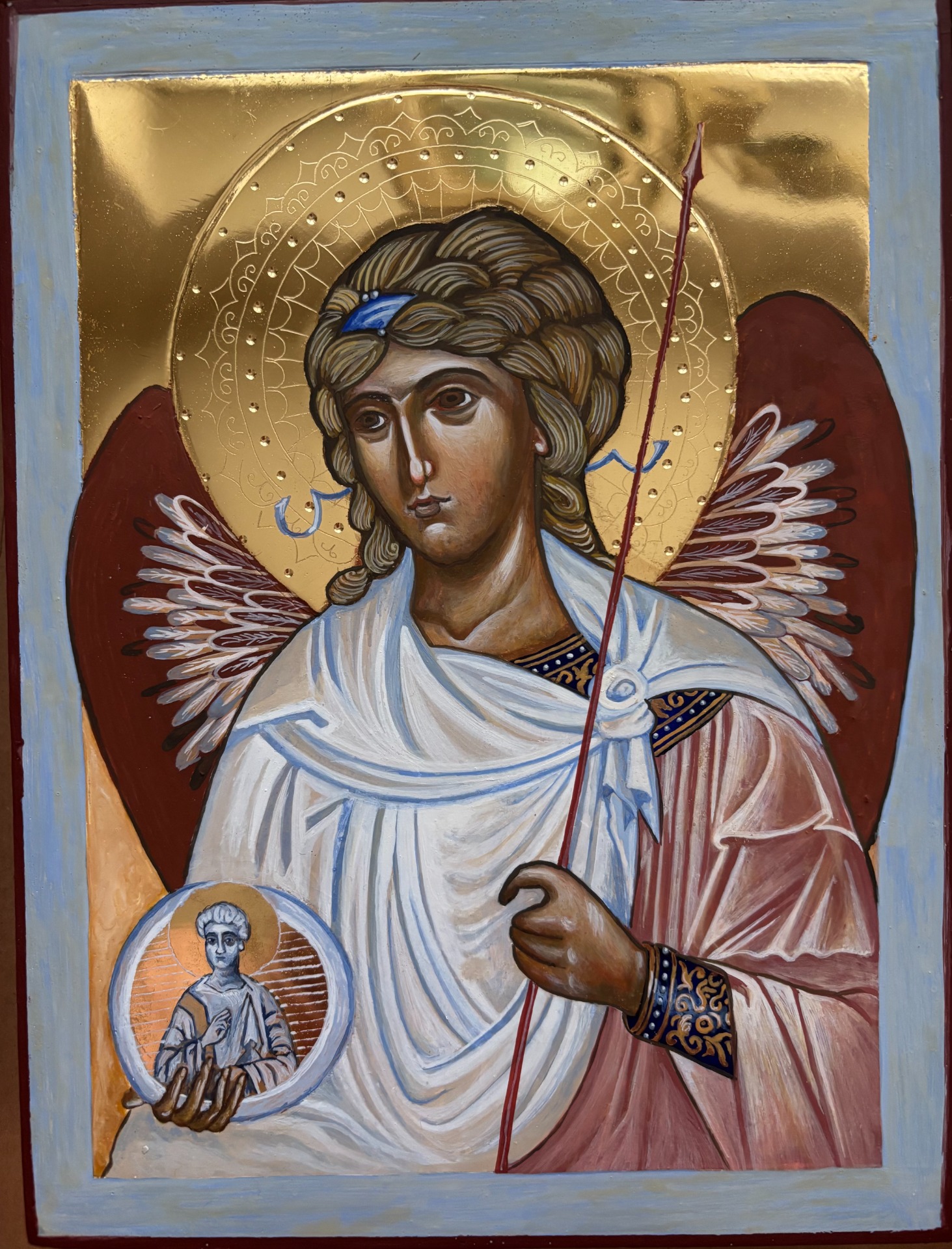Archanděl Michael, zlato 23,75 kar, dřevěná deska, levkas, vaječná tempera Prodáno. Na objednávku